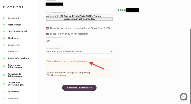 Klicken Sie unten auf der Seite auf „Wohnsitznachweis erneut hochladen“. Laden Sie den korrekten Wohnsitznachweis hoch.