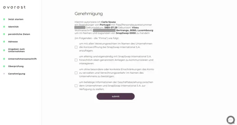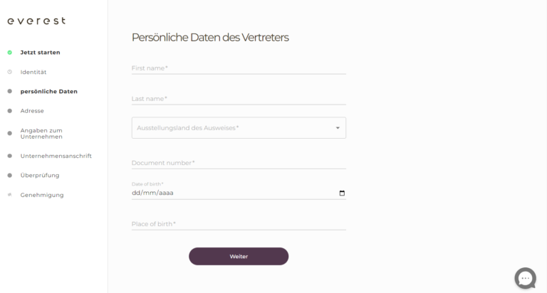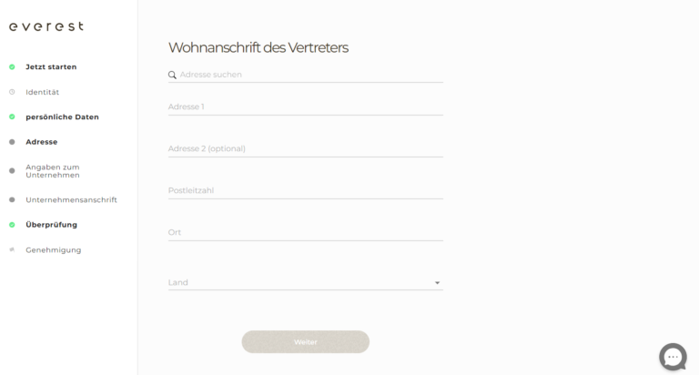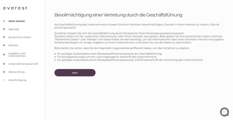 Los geht’s! Als Geschäftsführung des Unternehmens müssen Sie eine Vertretung bevollmächtigen, Everest in Ihrem Namen zu nutzen. Dies ist ein schneller Vorgang.