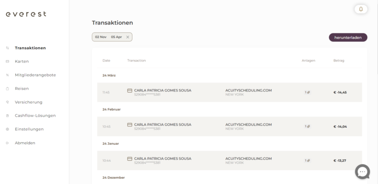 Um eine Transaktion in Ihrem Dashboard zu finden, klicken Sie auf den Tab „Transaktionen“ auf der linken Seite des Dashboards. Hier finden Sie eine Auflistung Ihrer Transaktionen sortiert nach Monaten. Oder Sie klicken zunächst auf den Tab „Karten“ und dann auf „Transaktionen“.