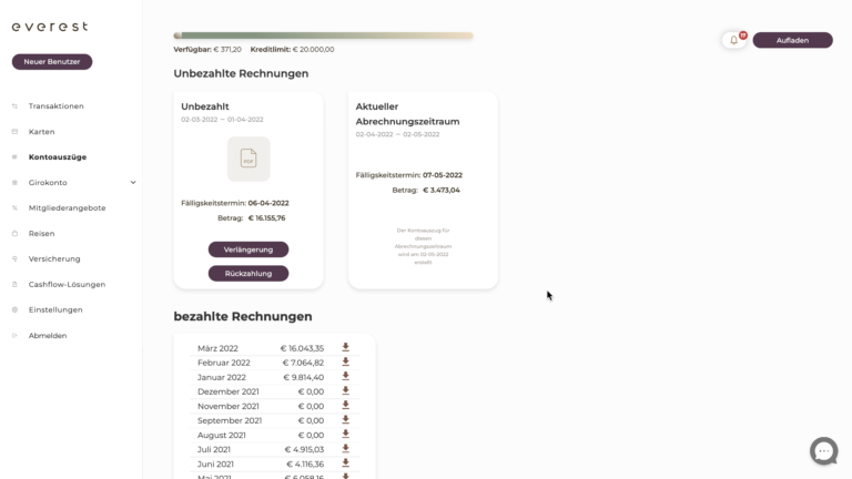 In Ihrem Dashboard sehen Sie alle mit Ihrem Konto verknüpften Auszüge, so dass Sie Monat für Monat den Überblick über Ihre Ausgaben haben. Auch wenn Sie kein Kreditlimit haben, können Sie Ihr Konto aufladen, das Geld für Ihre Ausgaben verwenden und erhalten die Abrechnung am Ende des Zeitraums.