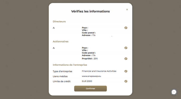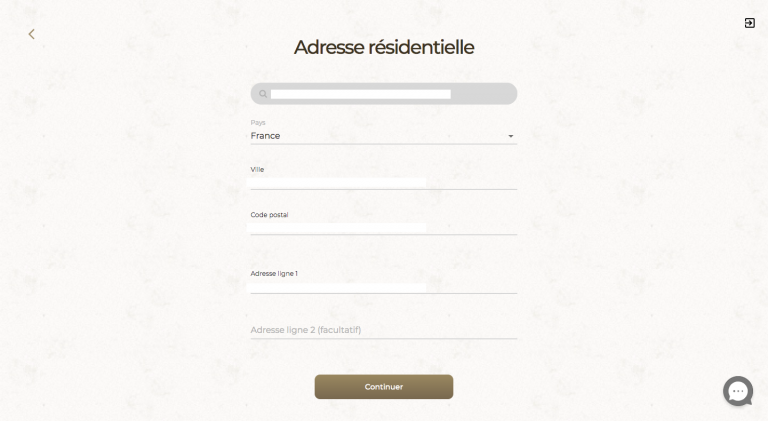 Pour compléter les informations sur les bénéficiaires effectifs, nous avons besoin d’obtenir leur adresse de résidence. Cliquez sur “Continuer” pour confirmer.