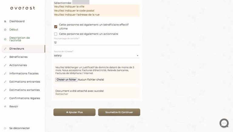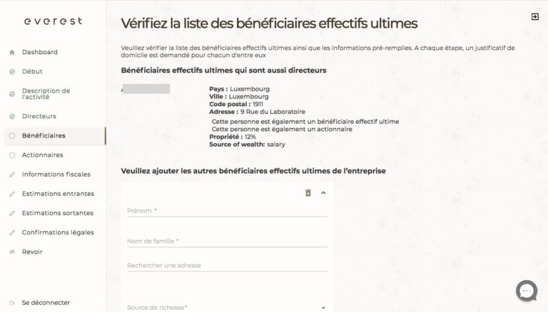 Nous vous demandons dans cette étape de vérifier les informations que vous avez fournies concernant les bénéficiaires effectifs ultimes dans la première étape du processus d’enregistrement. Vous devez ajouter un justificatif de domicile pour chaque bénéficiaire datant de moins de 3 mois soit en format PDF ou image.