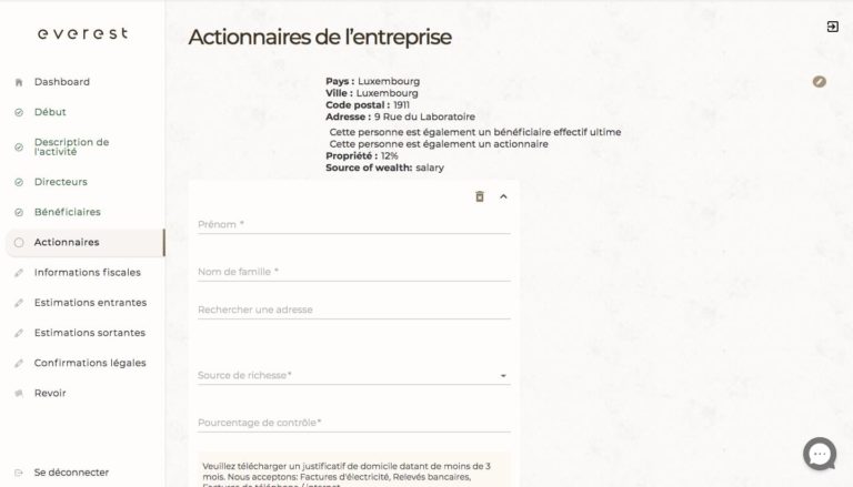 Dans cette étape, veuillez vérifier les informations que vous avez fournies concernant les actionnaires dans la première étape du processus d’enregistrement. Vous devez ajouter un justificatif de domicile pour chaque actionnaire datant de moins de 3 mois soit en format PDF ou image.