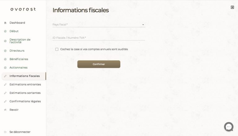 Veuillez renseigner les informations fiscales de votre entreprise dont le pays ainsi que le numéro de TVA. Si vos comptes ont été audités, veuillez cocher la case et choisir l’année d’audit dans le menu déroulant.