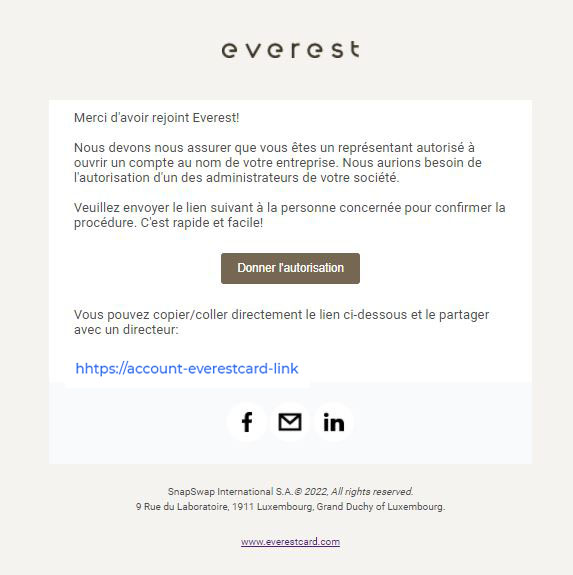 C’est parti ! En tant que directeur de la société, vous devez autoriser votre représentant à utiliser Everest en votre nom. C’est un processus rapide.