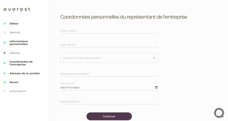 La prochaine étape consiste à entrer les données personnelles de votre représentant pour qu’il puisse utiliser Everest en votre nom.