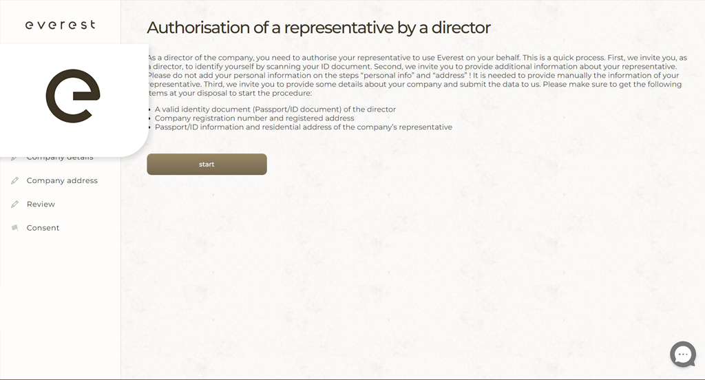 En tant que directeur de la société, vous devez autoriser votre représentant à utiliser everest en votre nom.