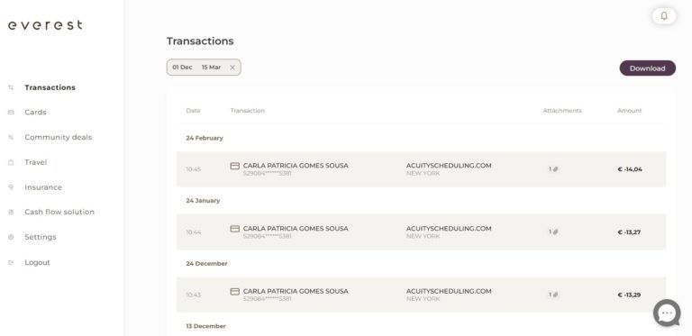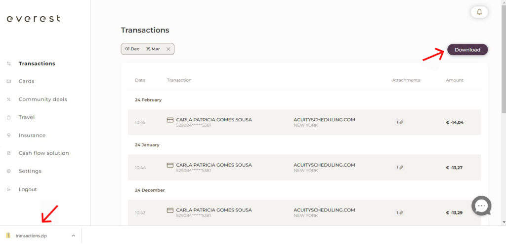 If you need to download the transactions, click on “Download” and you will receive the file right into your computer.