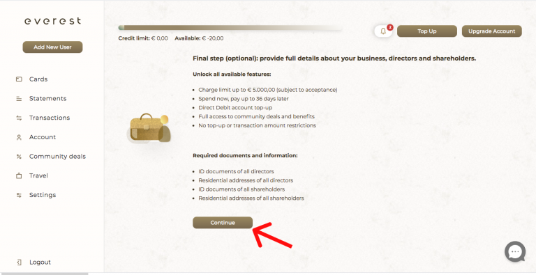 Now that you’ve opened your basic account with Everest, please click “Continue” to upgrade your account.