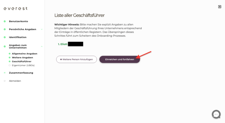 Wenn Sie die Daten aller Direktoren ordnungsgemäß geändert haben, klicken Sie auf „Einreichen und fortfahren‘ und dann auf „Zusammenfassung“.