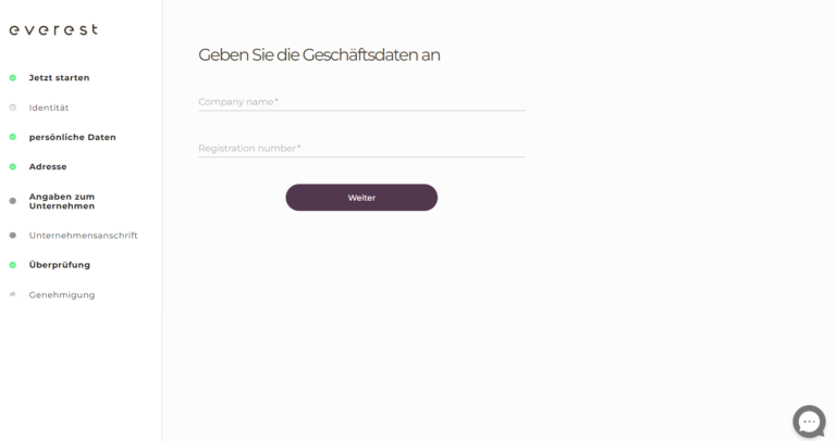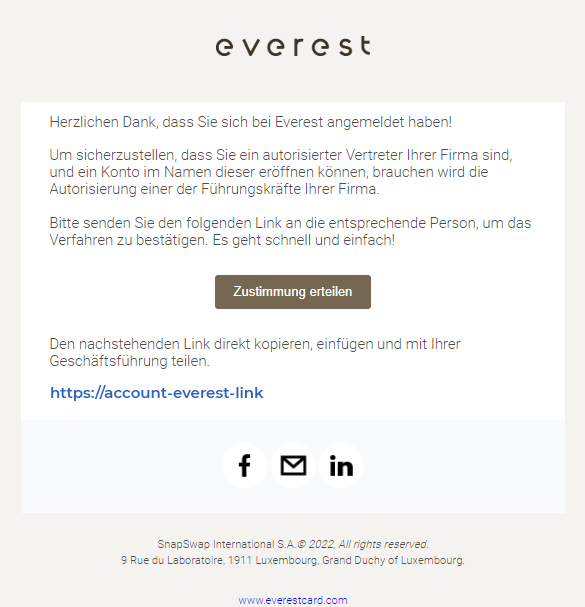 Los geht’s! Als Geschäftsführung des Unternehmens müssen Sie eine Vertretung bevollmächtigen, Everest in Ihrem Namen zu nutzen. Dies ist ein schneller Vorgang.