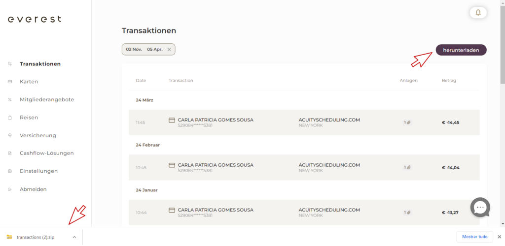 Um eine Transaktion in Ihrem Dashboard zu finden, klicken Sie auf den Tab „Transaktionen“ auf der linken Seite des Dashboards. Hier finden Sie eine Auflistung Ihrer Transaktionen sortiert nach Monaten. Oder Sie klicken zunächst auf den Tab „Karten“ und dann auf „Transaktionen“.