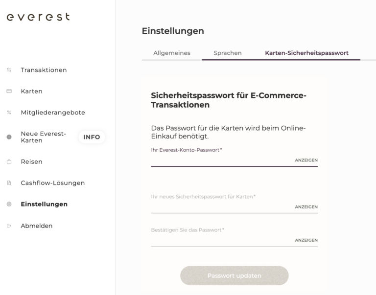 Geben Sie Ihr Everest-Kontopasswort ein (dasjenige, das Sie zum Einloggen verwenden) und richten Sie das neue Sicherheitspasswort für Karten ein (um Online-Transaktionen durchzuführen). Danach klicken Sie bitte auf „Passwort aktualisieren“.