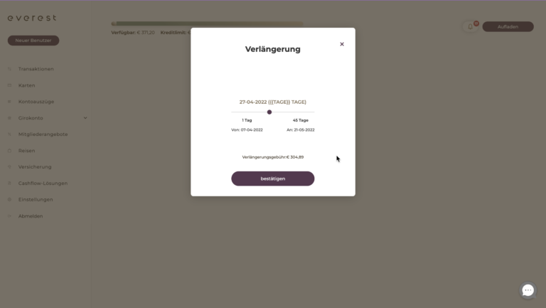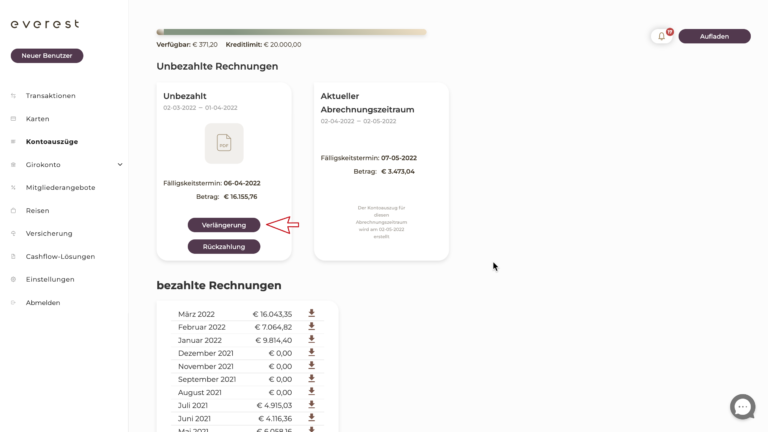 Wenn Sie über ein von Everest genehmigtes Kreditlimit verfügen, erhalten Sie die Abrechnung ebenfalls am Ende des Monats. Sie können die Abrechnung innerhalb der nächsten 5 Tage nach Erhalt begleichen oder die Zahlung verschieben, wenn Sie sie am Ende des Zeitraums nicht vollständig begleichen können.