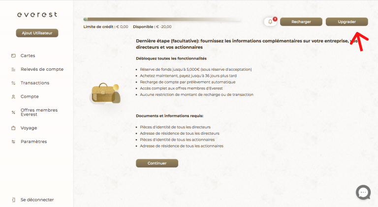 Maintenant que vous avez ouvert votre compte basique chez Everest, veuillez cliquer sur “Continuer” pour mettre à niveau votre compte.