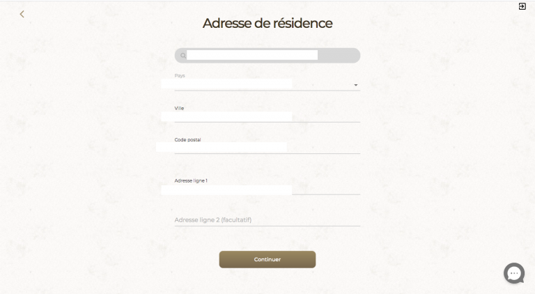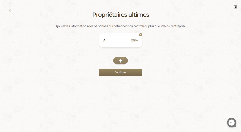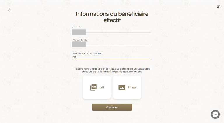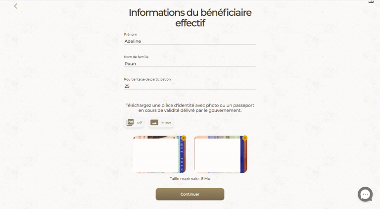Pour compléter les informations sur les bénéficiaires effectifs, nous avons besoin d’obtenir leur adresse de résidence. Cliquez sur “Continuer” pour confirmer.