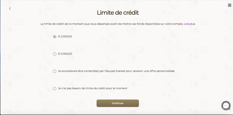 Cette étape vous permet de demander une limite de crédit, sous réserve d’acceptation de notre part. Nous étudierons le profil de votre entreprise pour vous accorder ou non la limite de crédit. Veuillez sélectionner l’option que vous souhaitez et confirmer en cliquant sur “Continuer”.
