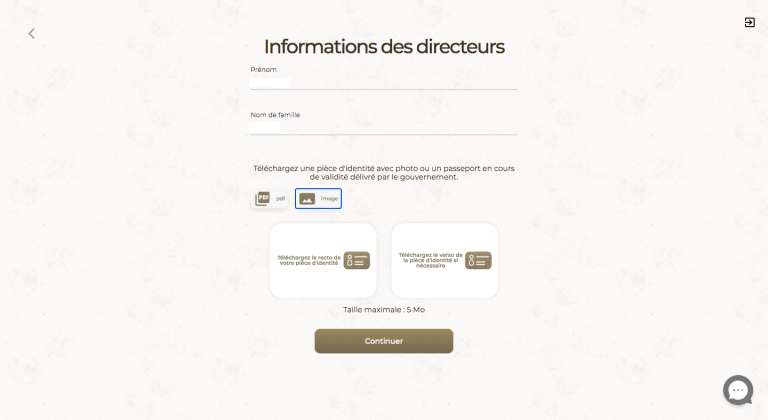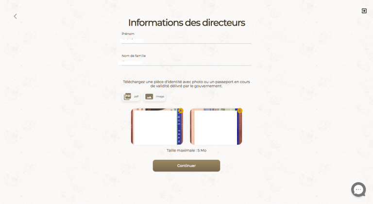 Ensuite, nous avons besoin de vérifier l’identité des directeurs de l’entreprise. Renseignez le prénom, le nom.