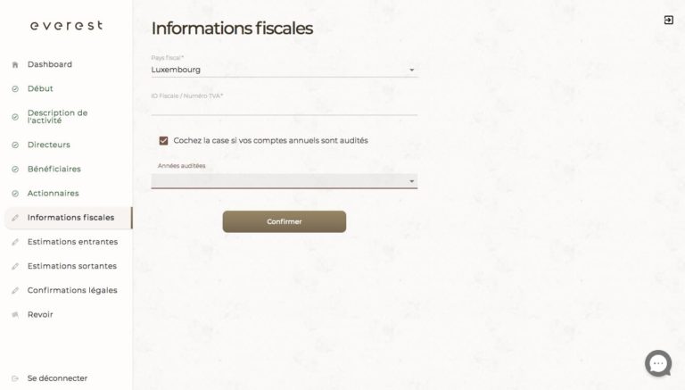 Veuillez renseigner les informations fiscales de votre entreprise dont le pays ainsi que le numéro de TVA. Si vos comptes ont été audités, veuillez cocher la case et choisir l’année d’audit dans le menu déroulant.