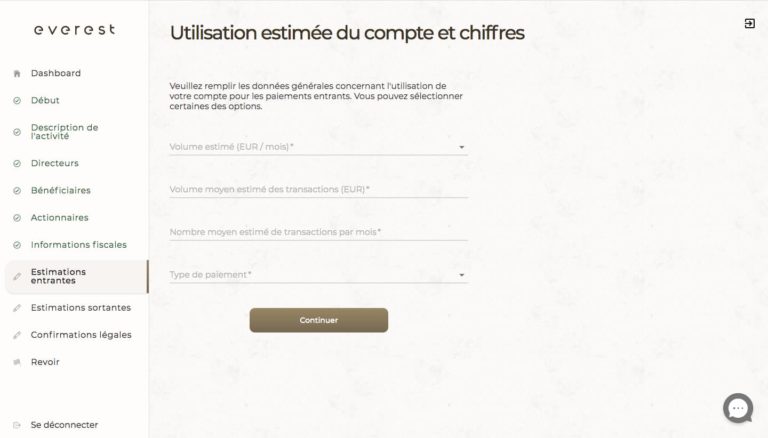 Dans cette étape, nous vous demandons une estimation concernant les paiements entrants afin de mieux comprendre votre niveau d’utilisation du compte.