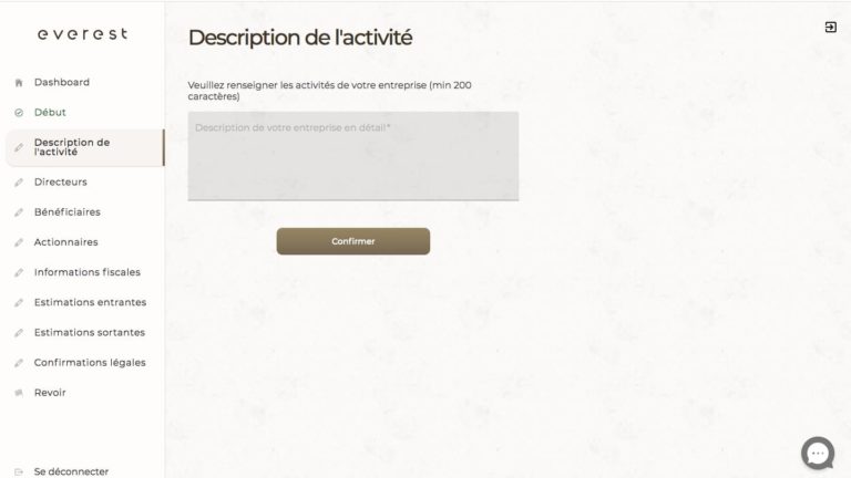Veuillez décrire les activités de votre entreprise dans le champ (200 caractères), puis confirmer.