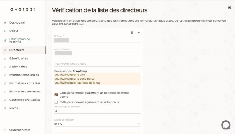 Nous vous demandons dans cette étape de vérifier les informations que vous avez fournies concernant les directeurs dans la première étape du processus d’enregistrement. Vous devez ajouter un justificatif de domicile pour chaque directeur datant de moins de 3 mois soit en format PDF ou image.