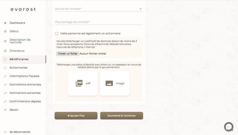 Nous vous demandons dans cette étape de vérifier les informations que vous avez fournies concernant les bénéficiaires effectifs ultimes dans la première étape du processus d’enregistrement. Vous devez ajouter un justificatif de domicile pour chaque bénéficiaire datant de moins de 3 mois soit en format PDF ou image.