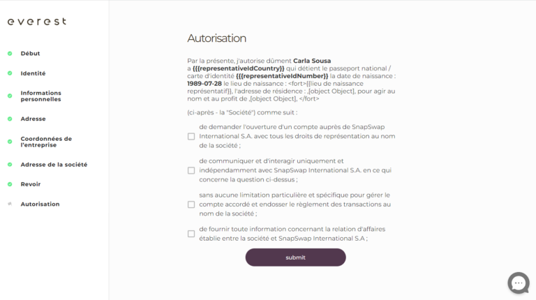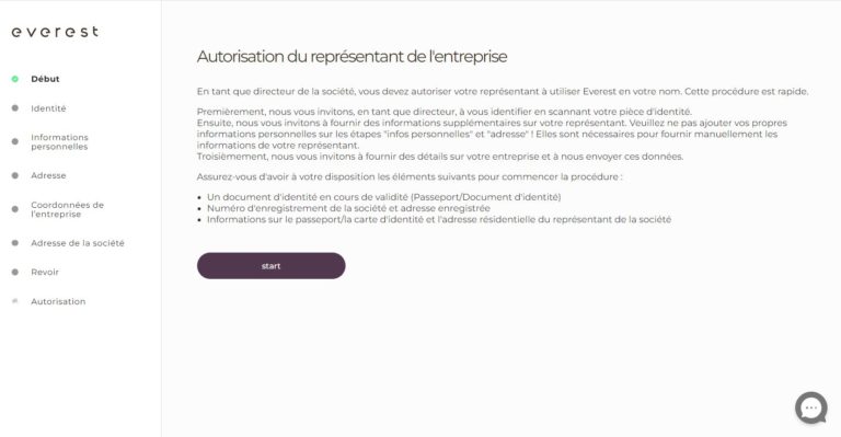 C’est parti ! En tant que directeur de la société, vous devez autoriser votre représentant à utiliser Everest en votre nom. C’est un processus rapide.