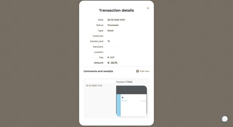 If you want to upload a receipt corresponding to a transaction, click on the “+” sign next to the transaction. You can upload a PDF, a PNG or a JPEG file at your convenience, the maximum size is 5 MB. Then add the file and click on Save.
