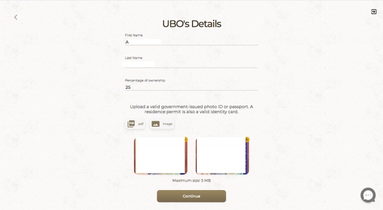 Then, if you wish to add new ultimate beneficial owners, click on “+” or on “Continue” if you only wish to confirm the data entered in the previous step.